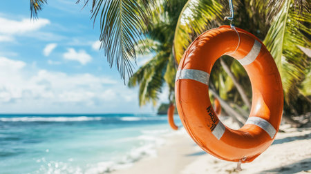 Life-saving rescue tubes hanging from coconut palms, set against a beautiful beach backdrop, underlining the importance of beach safety.