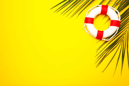 Red-white lifebuoy with palm leaf on yellow background. Top view