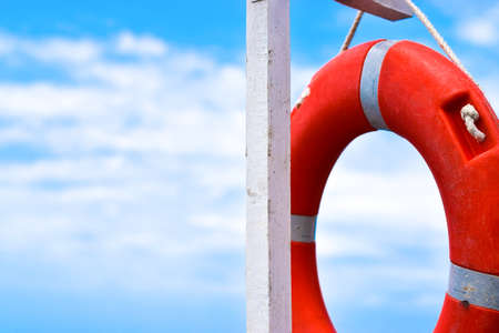 Red lifebuoy against the backdrop of the sea. Support concept and help