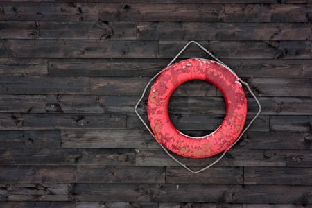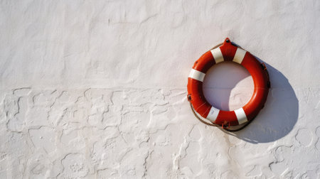 Red lifebuoy with white bands mounted on textured wall