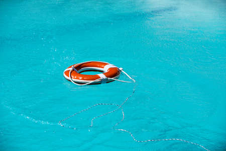 Lifebelt on sea or pool. Orange inflatable ring floating in blue water. Life buoy for protect and safety drowning.