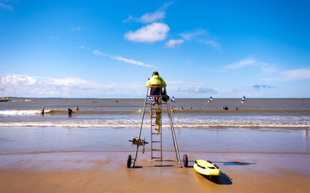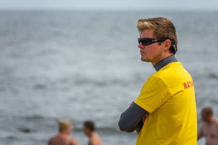 Sarbinowo, Poland - August 2017 : Lifeguard on the beach observing swimmers in the sea