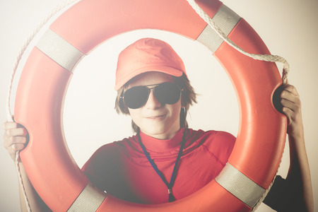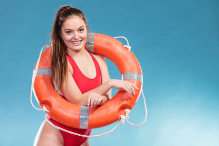 Lifeguard woman girl with ring buoy lifebuoy supervising.