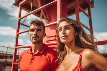Advertising portrait shot of a baywatch guards in red swimsuits standing together in a Lifeguard Tower and they look at the camera. Generative AI