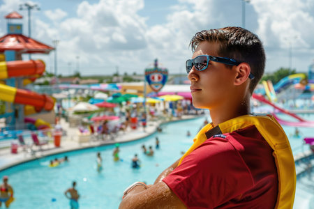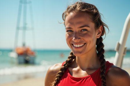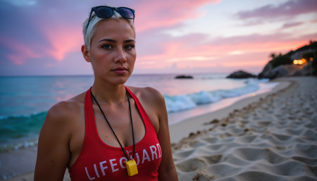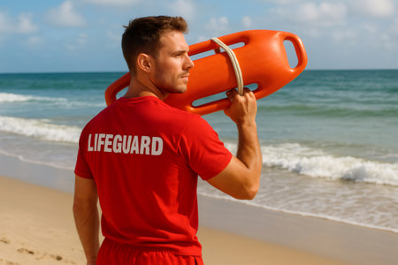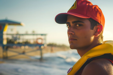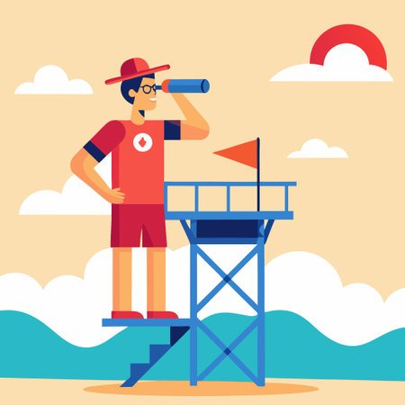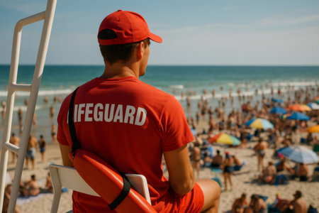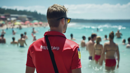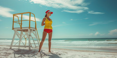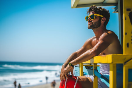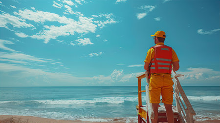 Lifeguard on duty watching coastline and ocean, alert and ready to protect beachgoers with confidence and professional vigilance