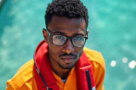 Young man with curly hair and glasses, wearing a yellow life jacket, is looking off to the side, possibly indicating he's a lifeguard or involved in water safety.