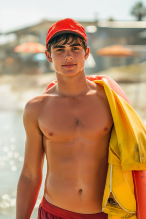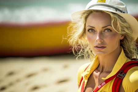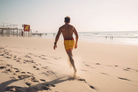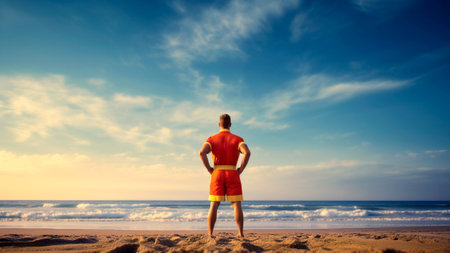 A strong seaside protector peering into the distance, guarding the shoreline, assuring safety along the coast in the peak of summer. Generative AI