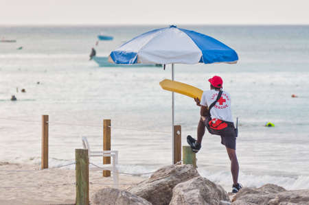 Eleuthera, Bahamas - December 7, 2011: A red cross lifeguard is patrolling the tropical beach of the Princess Cays, Eleuthera Islands in the Bahamas on December 7, 2011.
