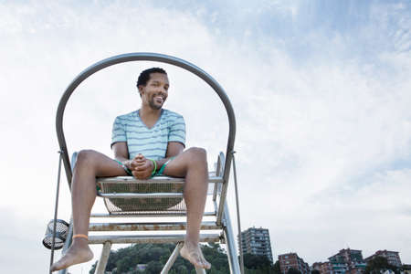 Handsome lifeguard with life buoy on watch tower, low angle view