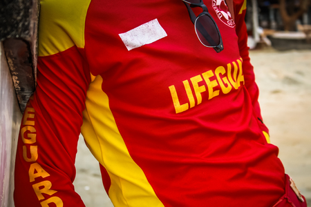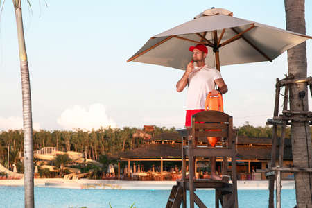 Sanya, China - May 15, 2019: A lifeguard on beach keeps order and safety. In the hands of a whistle to ensure the discipline. T-shirt with the inscription Lifeguard in English and Chinese.