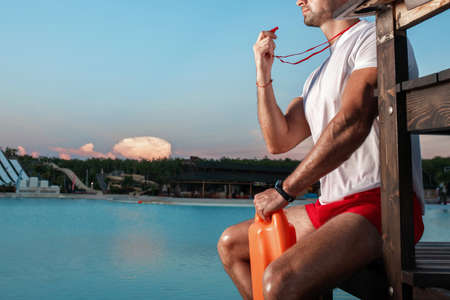 Professional lifeguards with life buoy and whistles on watch tower, low angle view