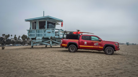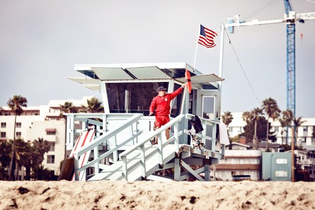 LOS ANGELES, USA - JULY 24: Lifeguard tower on Santa Monica State Beach on July 24, 2012 in Santa Monica, California. Santa Monica has 3.5 miles of well-maintained California beach locations and enjoys on average 340 days of sunshine