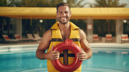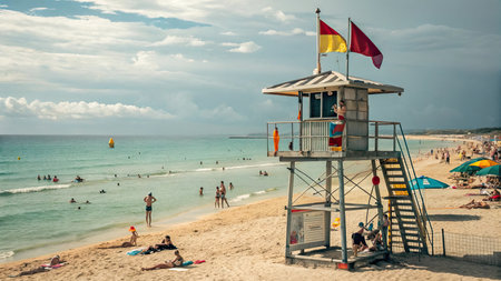 A lifeguard is enjoying the warm sun while carefully overseeing beachgoers on a beautifully sunny day. Generative AI