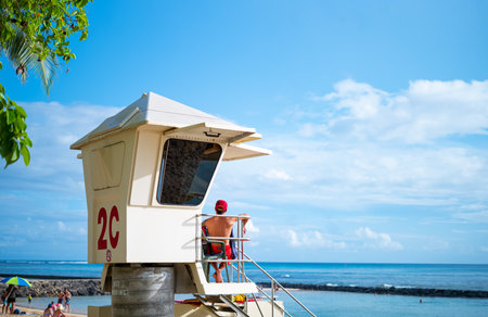 Honolulu, Awaii - April 30, 2019: Â A shed with beach attendant in the waikiki district