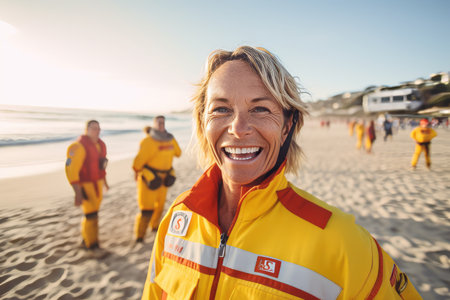 Advertising portrait shot of a Lifeguard team team standing together in a beach and they look at the camera. Generative Ai