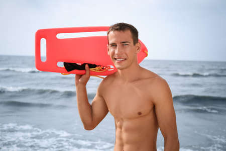 Portrait of male lifeguard holding life belt against beach against clear sky