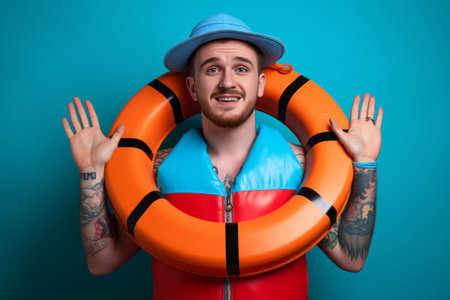 Playful young man carrying inflatable ring and gesturing while standing against red background : Generative AI