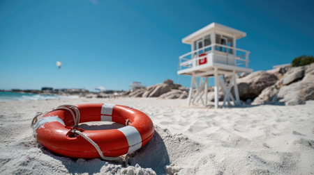 A vibrant beach scene featuring a lifeguard tower in the background and a bright orange life ring on the sand. Ideal for summer-themed projects.