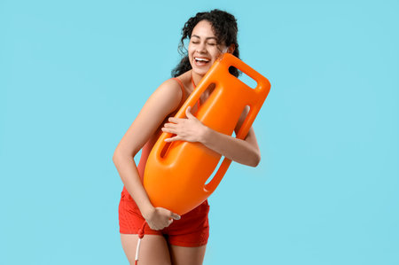 Beautiful young happy African-American female lifeguard with rescue buoy on blue background