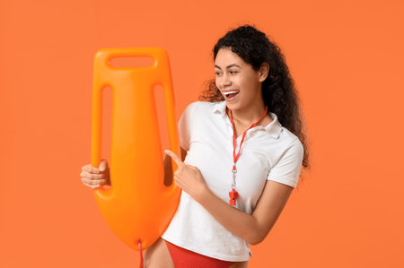 Beautiful young happy African-American female lifeguard pointing at rescue buoy on orange background