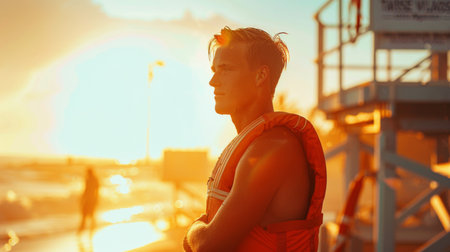 Focused young man in a lifeguard outfit looks out to the sea during a peaceful sunset