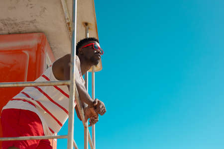 Low angle view of african american young man in sunglasses standing on lifeguard hut against sky. copy space, summer, protection, unaltered, beach, lifestyle, enjoyment and holiday concept.