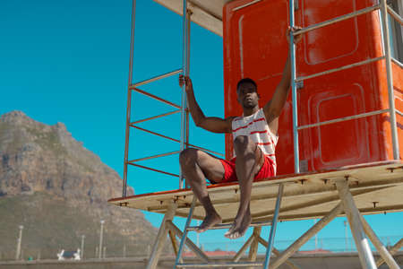 Low angle view of african american young man looking away standing on lifeguard hut against blue sky. contemplation, protection, unaltered, beach, lifestyle, enjoyment and holiday concept.