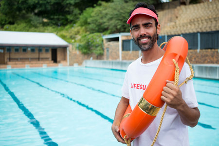 Male lifeguard with red visor holding orange rescue buoy with rope beside pool lanes, copy space. Safety, aquatic, leisure, outdoor, equipment, fitness, supervision