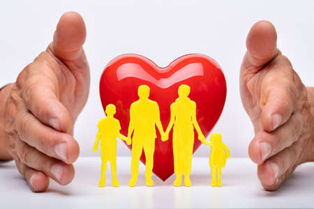 Person Hand Protecting Family Paper Cut With Red Heart On White Desk
