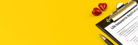 Life insurance form. Banner. Clipboard with agreement, pen and red heart on a yellow desktop. Top view