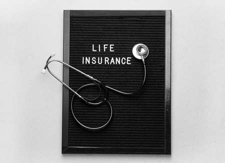 Chalk board with text LIFE INSURANCE and stethoscope on light background