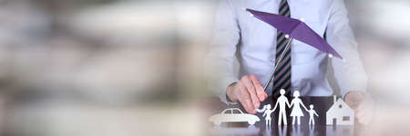 Man holding an umbrella protecting a family, a house and a car; panoramic banner
