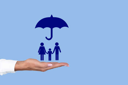 Umbrella over the concept of family for protection, safety, finance and insurance on a female palm. Copy space. High quality photo