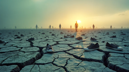 People are walking away at sunset, leaving their shoes on a cracked earth, creating a suggestive concept image