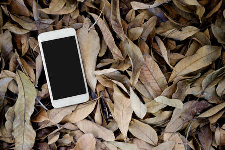 smart phone on of dry leaves. Flat lay.