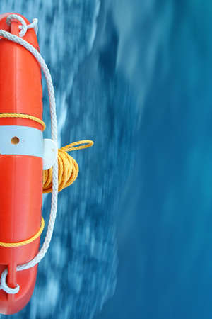 Red Lifebuoy with blue sea water flowing in the background
