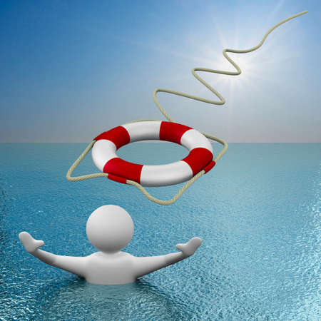A person in open water extends a hand near a life ring, suggesting distress. The image displays a bright, daytime scene with blue tones dominating the composition. The life ring offers a visual focal point. Its potential uses span across various commercial and editorial contexts related to safety and assistance.