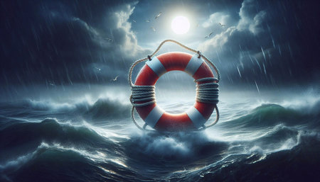 Hand reaches for lifebuoy in stormy water. Survival and hope concept