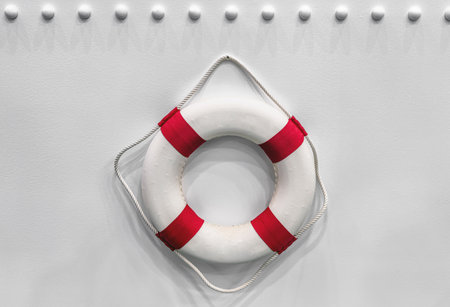 Lifebuoy mounted on a ships wall standing ready for emergencies during a calm day at sea