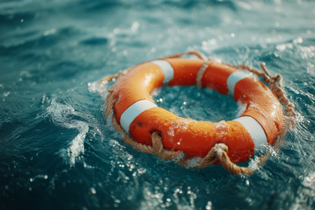 An image captures a person's hand reaching towards an orange life ring in water. The composition showcases the bright ring and a hand against a blue water background. The scene suggests a rescue scenario with potential use in illustrating themes of safety, support, and help. It can be used for various commercial or editorial applications.