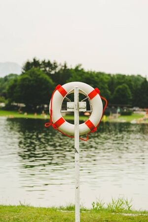 Close up picture of a safety buoy at a swimming lake, summer time