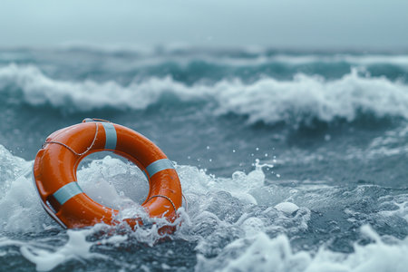 Lifebuoy floats in rough sea waters. Safety and rescue concept. Generative AI