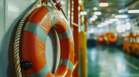 A vibrant lifebuoy hangs on the ship deck, highlighting safety measures in maritime settings. The blurred interior showcases the importance of preparedness on the water.
