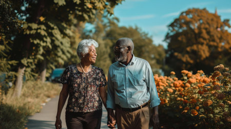 An elderly couple from different ethnicities holding hands while taking a walk, their faces telling a rich story of a life shared and cherished.