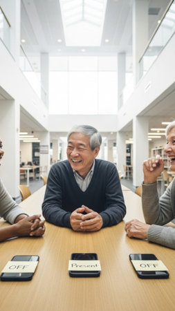 Portrait of senior college professor sitting at table with students and recording online lesson via smartphone