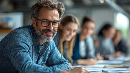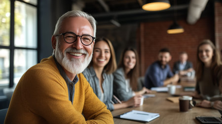 Confident mature man at a business meeting, smiling into the camera with colleagues blurred in the background highlighting teamwork and collaboration.