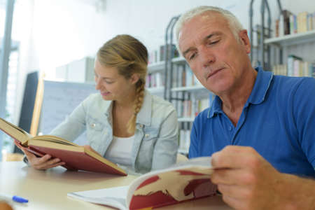 College student in eyeglasses reading a book and studying together with the teacher at the table