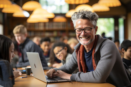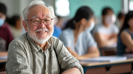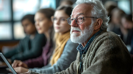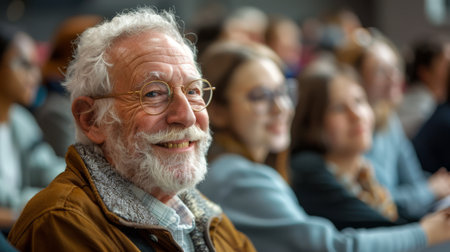 Happy senior man is sitting at a lecture in class with young students. Continuous learning, Improvement concept. Generative ai.