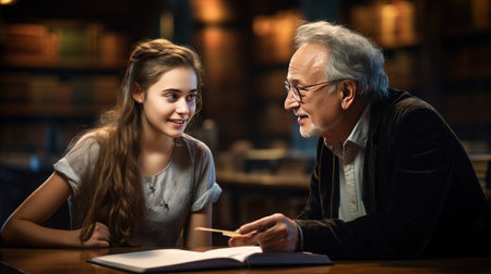 A heartwarming scene of a grandparent assisting their grandchild with homework, showcasing the joy of learning and the bond between generations in a cozy indoor setting.