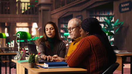 Multiethnic group of students discussing about academic materials, reading and doing research for upcoming exams. Diverse people showing commitment for personal growth.